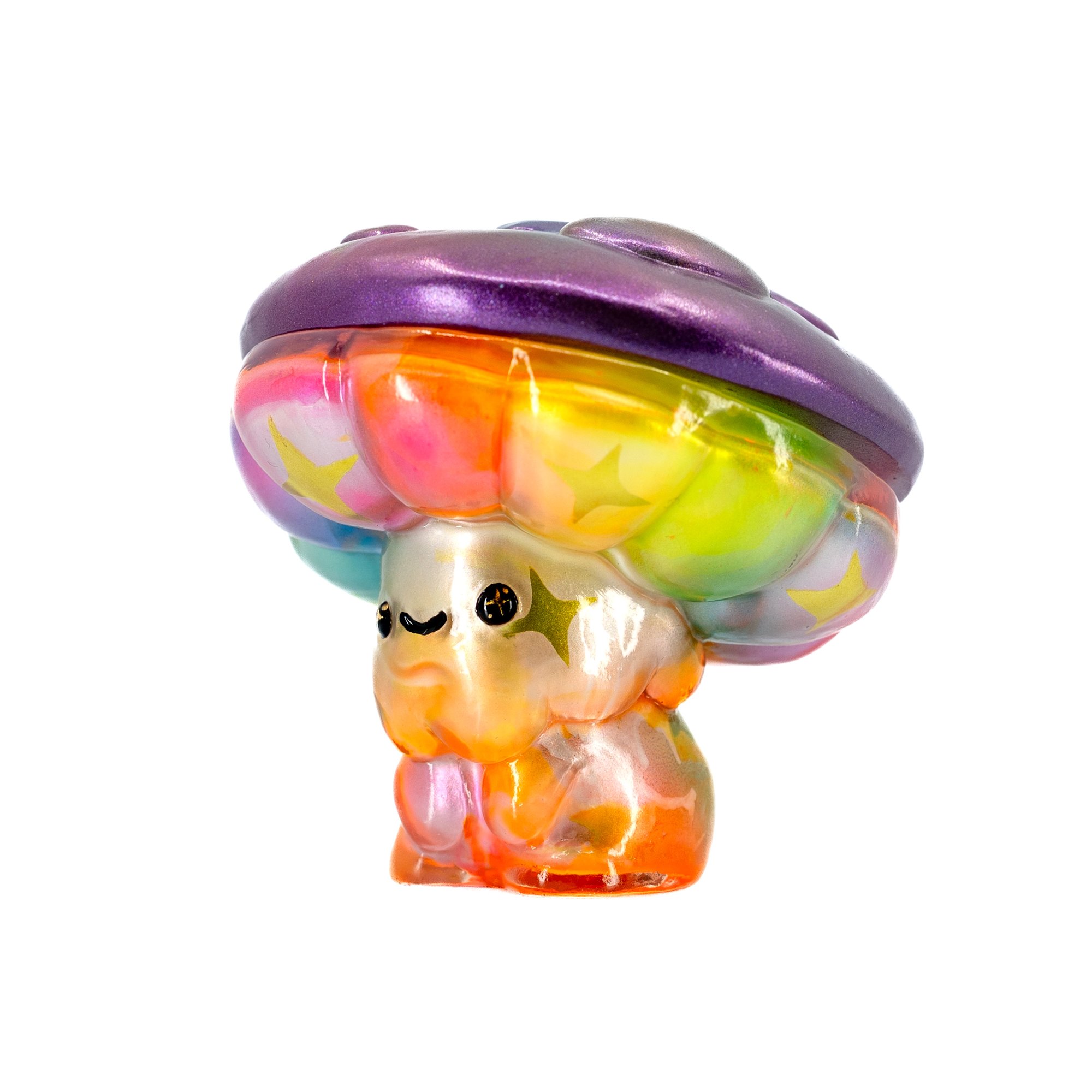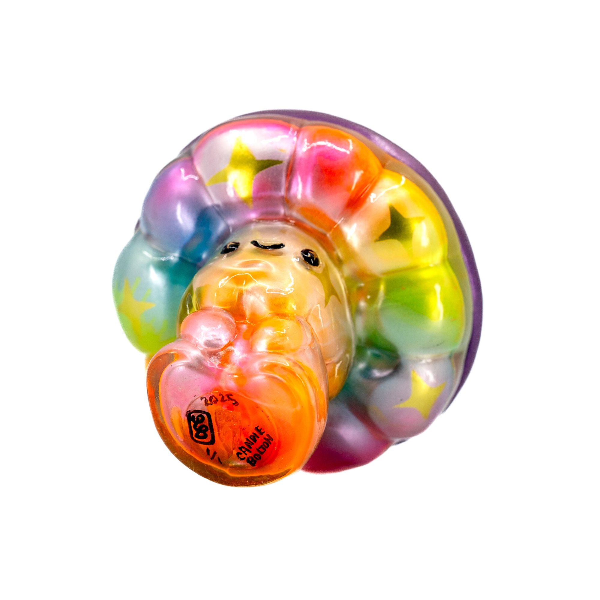 One-off clear sofubi SHUMI featuring clear rainbow inside paint with metallic gold sparkles painted on the inside. This is my first time every trying out inside paint on a toy!